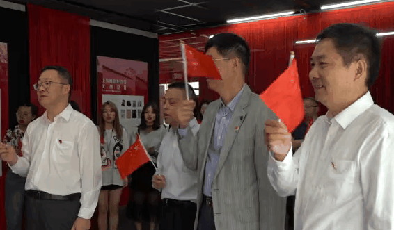 上海戏剧学院党委书记谢巍,上海戏剧学院党委副书记、副院长张伟令,上海戏剧学院副院长唐立兔、杨扬及教务处处长沈亮、党院办副主任刘俊、创意学院副院长(主持工作)刘志新等出席开幕式。谢巍书记宣布展览开幕,现场全体师生挥舞国旗高唱《我和我的祖国》,激情喜悦的氛围同“致敬为建立新中国而奋斗的光辉岁月”的主题完全融为一体。