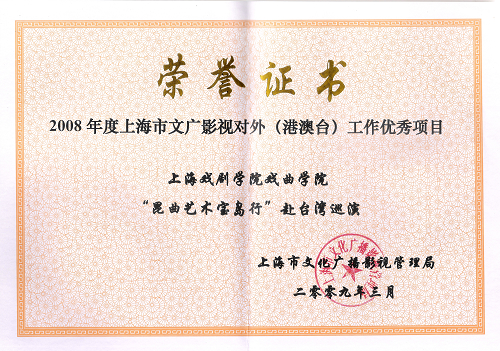 3月3日上午,由上海市文化广播影视管理局组织召开的2008年度上海市文广影视对外(港澳台)工作总结会议在上海图书馆多功能厅举行。会议总结了08年度本市文广影视对外工作,并对工作中表现突出的单位、个人及项目进行了表彰。戏曲学院的“昆曲艺术宝岛行”赴台湾巡演被评为2008年度上海市文广影视对外(港澳台)工作优秀项目。