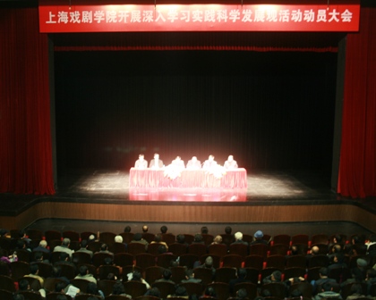 今天下午,在前一阶段认真做好各项准备工作的基础上,我校在上戏剧院举行开展深入学习实践科学发展观活动动员大会。会议主要任务是认真贯彻落实中央、市委、市教卫党委关于开展深入学习实践活动的精神,按照市委、市教卫党委有关总体安排和要求,对我校开展学习实践活动进行全面动员和部署。我校党委书记、校学习实践活动领导小组组长楼巍同志作动员报告。教卫党委学习实践活动第二指导检查组组长、原上海师范大学党委书记林樟杰同志代表检查组作重要讲话。我校主持工作副院长、校学习实践活动领导小组组长韩生主持大会。我校副院长、校学习实践活动领导小组副组长葛朗、刘志钢,第二指导检查组副组长施小明在主席台就座。检查组组员蒋尧鹏、杨伟岗、殷晨以及全校共产党员、教师和学生代表近500人出席会议。
