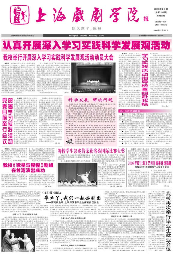 《上海戏剧学院报》2009年第2期已出版(总195期)已于2009年3月12日出版。本期重点内容有:《我校举行开展深入学习实践科学发展观活动动员大会》、《党委日前举行会议 部署学习实践活动》、《科学发展 解决问题》、《学习实践活动指导检查组赴我校》、《学习实践活动动态》、《我校《歌星与猩猩》剧组在台湾演出成功》、《舞校学生彭兆倩荣获洛桑国际比赛大奖》等,敬请关注。