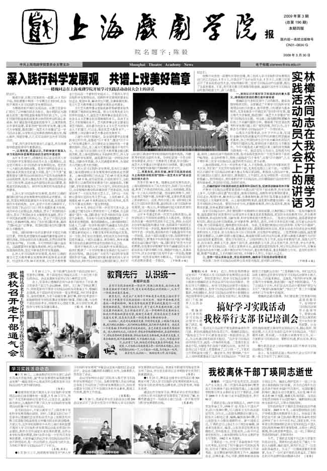 《上海戏剧学院报》2009年第3期已出版(总196期)已于2009年3月30日出版。本期重点内容有:《楼巍同志在上海戏剧学院开展学习实践活动动员大会上的讲话》、《林樟杰同志在我校开展学习 实践活动动员大会上的讲话》、《我校召开老干部通气会》、《搞好学习实践活动 我校举行支部书记培训会》、《学习实践活动动态》、《我校离休干部丁瑛同志逝世》、《校纪委召开工作会议 研究党风廉政建设干部大会议程》等,敬请关注。