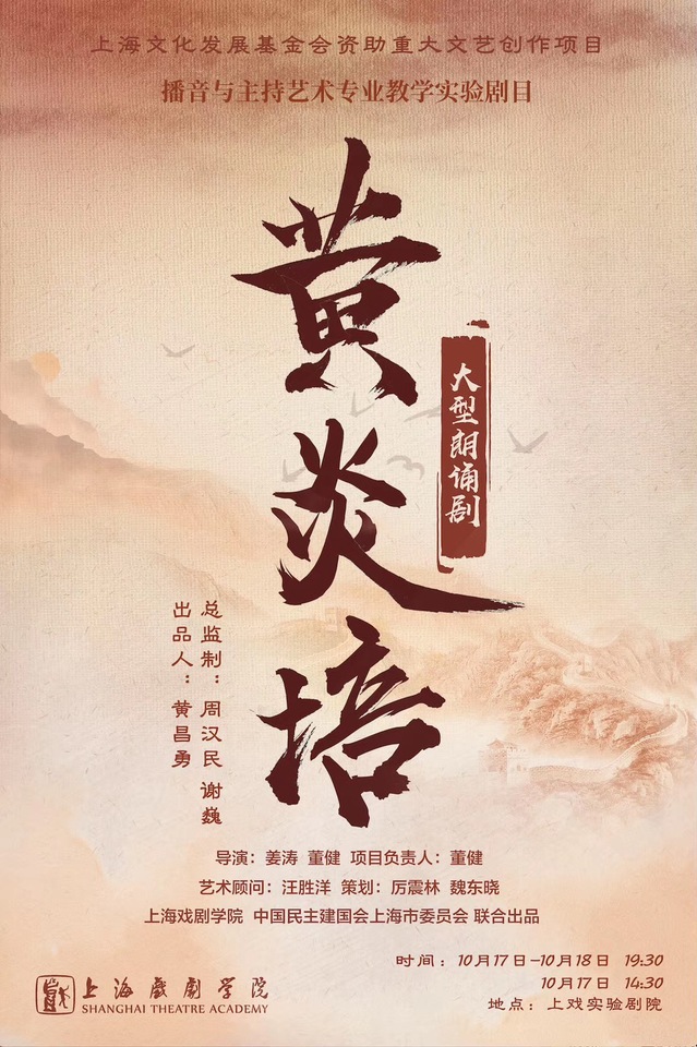 2019年,是中华人民共和国成立七十周年的华诞,为传承红色文化,弘扬爱国主义精神,上海戏剧学院与民主建国会上海市委联合打造的原创大型朗诵剧《黄炎培》于10月17、18日在上戏实验剧院上演,为新中国70华诞献礼。