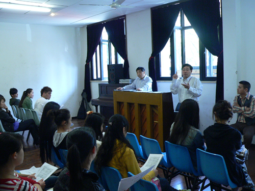 昨天(4月18日)下午,我校华山路校区红楼102教室传出了嘹亮的歌声。《毕业歌》、《义勇军进行曲》、《共青团之歌》、《歌唱祖国》等一首首耳熟能详的歌曲从表演系08级话剧本科班和08级内蒙本科班的50名同学的激情演绎中迸发。党委宣传部部长、表演系书记张生泉出席歌会的准备会并向大家作了动员。表演系声乐老师王复良进行了排练指导,宣传部王怿老师和08级班主任吕岩等有关教师也出席动员会。