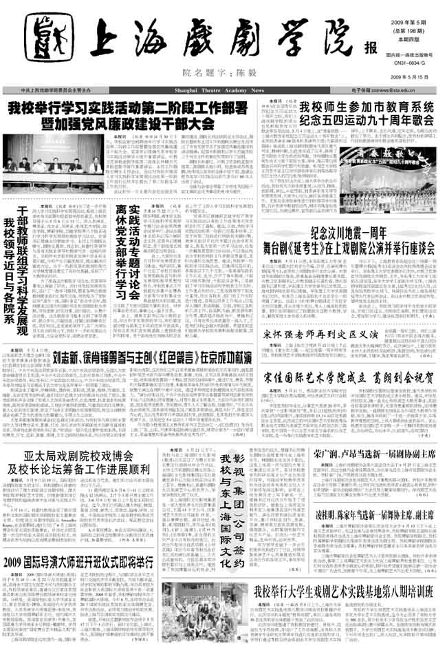 《上海戏剧学院报》2009年第5期已出版(总198期)已于2009年5月15日出版。本期重点内容有:《我校举行学习实践活动第二阶段工作部署暨加强党风廉政建设干部大会》、《我校领导近日与各院系干部教师联组学习科学发展观》、《离休党支部举行学习实践活动专题讨论会》、《刘志新、徐肖锋等参与主创<红色箴言>在京成功献演》、《我校师生参加市教育系统纪念五四运动九十周年歌会》、《纪念汶川地震一周年舞台剧《延考生》在上戏剧院公演并举行座谈会》等,敬请关注。(图文/小河 编辑/雨田)