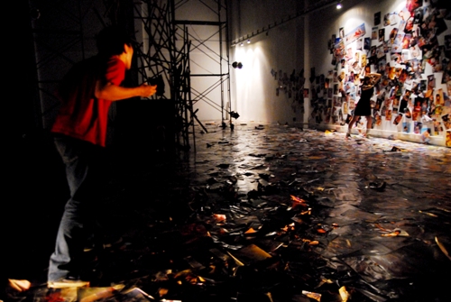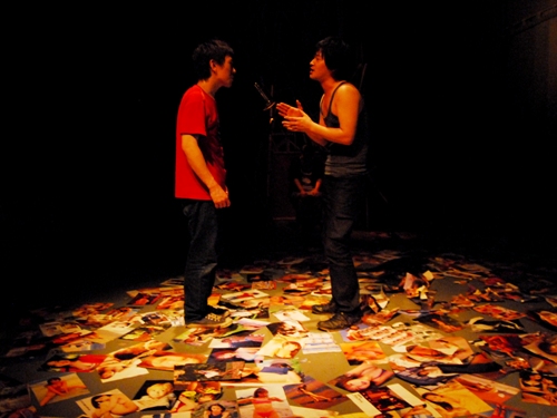 首先,导演对剧场进行了改造,舍弃了演员们的“台下”空间,下场则直接到舞台的最深处,这使舞台变得空旷而又深邃。然后值得一提的是铺天盖地的AV杂志,墙上、地上、座椅背上,无不杂乱的粘贴着。使整个剧场充满着浓郁的日本气息,导演奇思妙想的创意,意在营造种氛围,让戏剧未开始就让观众进入情境。而且对于铺排杂志,在零乱中可以看出大致的方向,在台上划了一道弧线,延伸到墙上。戏开始后,会发现这不单单是一种环境的营造,也是一种象征。它成为戏里必不可少的部分,其所用的纸张数量、粘贴所用的时间也可想而知。