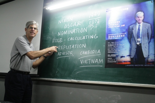 昨日晚6点,韦伯州立大学历史系教授葛瑞格刘易斯(GREGORY S. LEWIS)为我校师生带来一场题为《采访真相――<对话尼克松FROST/NIXON>影片分析》的精彩演讲,电视艺术学院方方教授主持讲座。此次讲座为市级精品课程系列讲座之一,由上海戏剧学院电视艺术学院、继续教育学院共同举办。