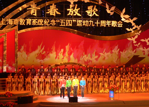 图为王嫣同学(前排右一)今年参加上海五四歌会的主持工作