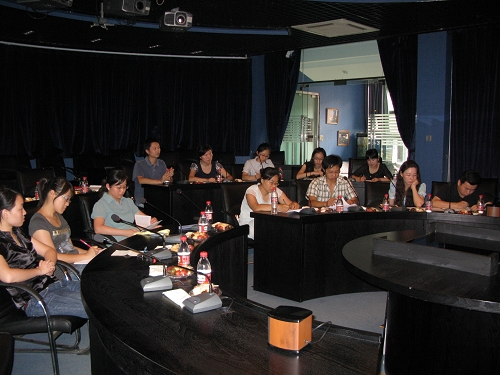 7月9日下午3时,2009上海市五四特色团委创建第九组互学互访活动在我校虚拟实验室召开。来自华东理工大学、上海外国语大学、上海中医药大学、上海金融学院、上海市胸科医院、上海师范大学、华东政法大学、上海同济大学、上海工商外国语职业学院等十所高校、单位以及团市委的老师们共聚一堂,对共青团的各项工作进行了热烈的讨论。