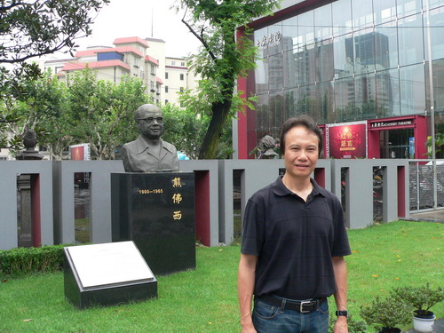 在已故老院长熊佛西雕塑前,魏照平深情留影