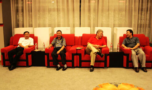 图为粟裕儿子粟寒生(左二)、陶勇儿子张小勇(左三)与我校领导交谈