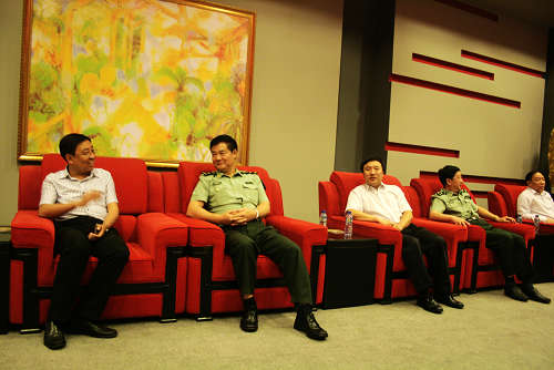 图为上海警备区政委李光金少将(左二)、副司令张先汉少将(左四)与我校领导交谈