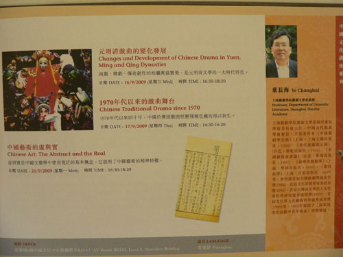 我校学术委员会主任、戏文系教授、博士生导师叶长海于9月16日至21日应香港城市大学邀请,出席了该校中国文化中心举办的“中国文化讲座系列”活动并分别就“元明清戏曲的变化与发展”、“1970年以来的戏曲舞台”、“中国艺术的虚与实”为题进行了三次学术讲座,收到了港大学生的好评。
