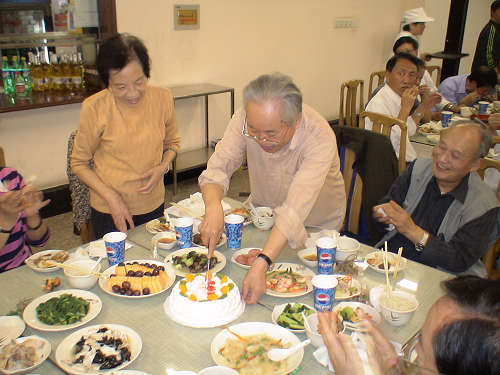 图为学校领导楼巍、韩生向退休教职工祝贺生日