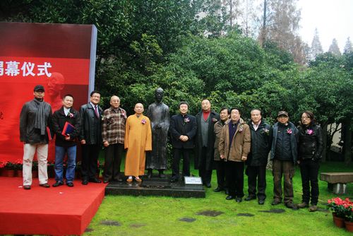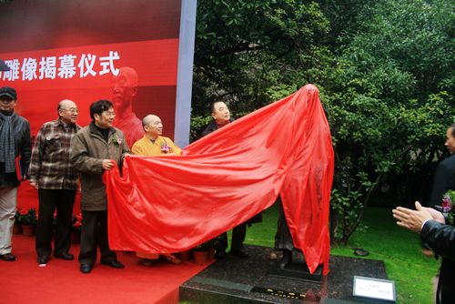 图为杨绍林先生、慧觉法师和叶长海教授共同为弘一法师雕像揭幕