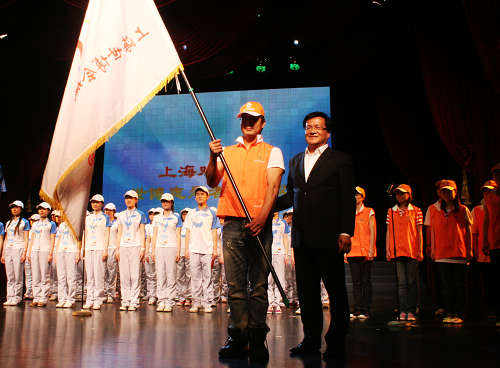 图为校世博志愿者总领队葛朗为志愿者授旗
