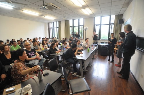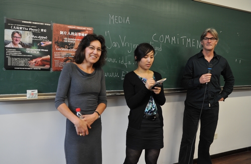 影片播放结束之后,该片的导演John Appel以及制片人Carmen Cobos都到教室与大家面对面交流,John Appel导演热情的为大家亲身讲述《<大玩家>背后》,而Carmen Cobos制片人则主要为大家介绍了《制片人的运筹帷幄》。讲座以师生问答的形式,在轻松活泼的气氛下进行。