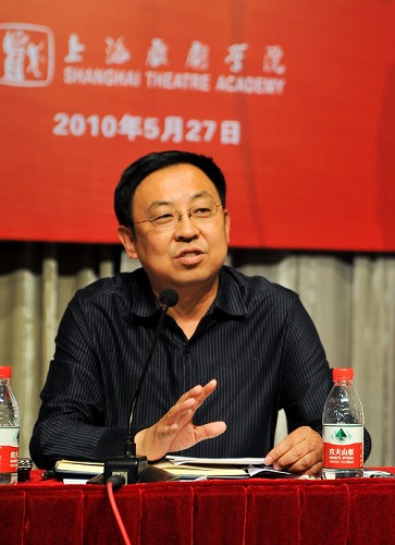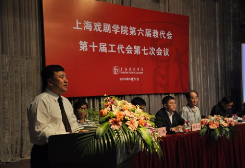 图为韩生院长在做《上海戏剧学院行政工作报告》