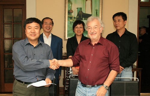 图为韩生院长与Gerard Gelas签订意向协议书后亲切握手