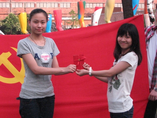 在同学们对于画的各抒己见之后,活动进入到了最后的环节――党员和积极分子站在党旗下发表感言。当两名同学将鲜红的党旗展开时,现场气氛顿时变得庄严起来。学生党员和积极分子有秩序地轮流上前发言。其中,有正式党员说:“虽然入党已有三年了,但是今天参加建党八十九周年大会上台宣誓时,心情还是抑制不住地激动。”有参加“世博志愿者”的新党员说:“当我们搀扶着残疾人过马路被文汇报的记者巧遇而采访时,记者看着我们胸前的党徽说‘你们是党员!’,那一刻我心里真的觉得无比的光荣与自豪!”有毕业生新党员说:“我从校领导手中接过那么精致和漂亮的党章和党徽时,心情无法形容,我真舍不得把它打开,但是我要经常打开学习,以后不论在什么岗位,我都会努力发挥党员的先进模范作用!为上海戏剧学院争光,为党旗争辉!”还有毕业生党员说:“要毕业了,真舍不得离开戏曲学院学生党支部这个大家庭,虽然马上就要离开学校了,但是希望以后还能回来参加这样生动的党组织生活。”入党积极分子听了党员们的感言后,也纷纷上去发言,他们都表示要向已经入党的同学学习,不断向组织靠拢,并希望以后能够多参加像这样的理论学习与社会实践相结合的党组织生活。发言完毕,老党员向新党员和积极分子递交了党章和党徽,希望他们能够接过责任的接力棒,不断为党组织注入新的活力。