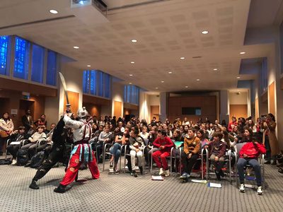 11月12日晚,应法国诺欧商务孔子学院的邀请,上戏巡演团在兰斯圣·约瑟中学剧场进行了专场演出。在演出开始之前,戏曲学院于翔老师为60余名圣·约瑟中学的学生进行了一场的京剧基本知识的普及讲座。讲座中现场气氛十分活跃,法国青少年对于京剧的表演程式表现出了浓厚的兴趣,纷纷要求上台跟学花旦、花脸等行当的典型动作。