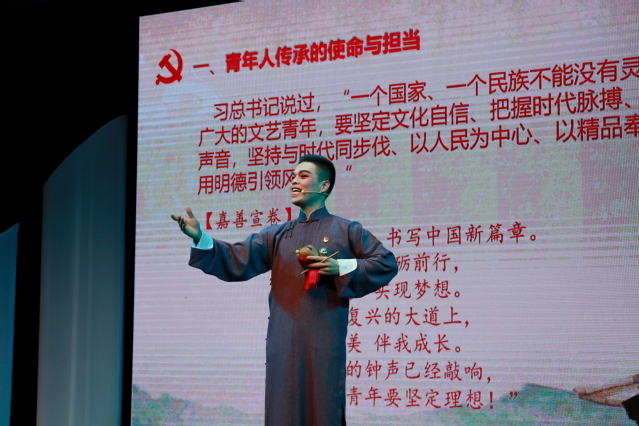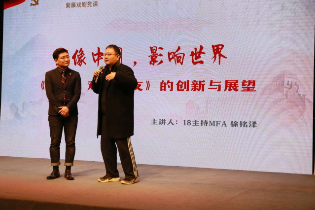 从戏曲故事中看见同学情,从舞蹈故事中看见师生情,第三篇章“影像中国、影响世界”中,18级主持MFA徐铭泽则让同学们看见了上戏学子的校友情。通过新中国成立以来上戏校友出演的影视剧片段集锦,同学们重温了校友们塑造的深入人心的艺术形象,感受到上戏人为弘扬社会主义先进文化作出的努力。徐铭泽也以自己参与创作的网剧《你好,对方辩友》为切入点,让同学们领略影像对于讲述中国故事、传播社会主义先进文化的影响力。上海颖立文化制片人、上戏校友王士龙来到党课现场,和同学们畅谈《你好,对方辩友》的台前幕后。该剧体现了主创团队对“青春剧”的思考与创新,打破窠臼,以自己最感同身受的青春故事传播正能量、展现时代青年的新风貌。