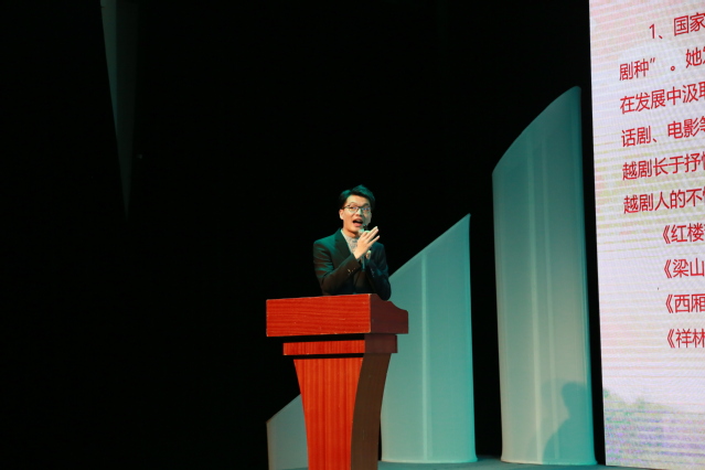 在第一篇章“守正创新,文化传承”中,17级导表演艺术博士研究生吴波讲述了原创实验戏·曲《绿袍情》的传承之路。《绿袍情》的主演,15级越剧表演本科生、上海越剧院青年演员张艾嘉向大家分享了自己从小学习戏曲的经历,并用嘉善宣卷演唱了总书记的语录,表演了《绿袍情》片段。中华优秀传统文化是中华民族的根和魂,是中国特色社会主义植根的文化沃土,吴波同学和张艾嘉同学的讲述与表演让大家看到了戏曲人对中华优秀传统文化的坚守,看到了他们传承并创新戏曲和曲艺的使命与担当。