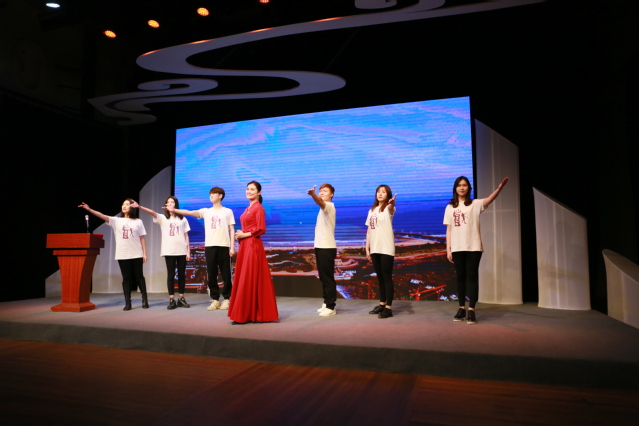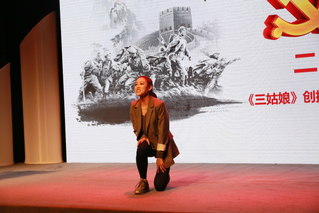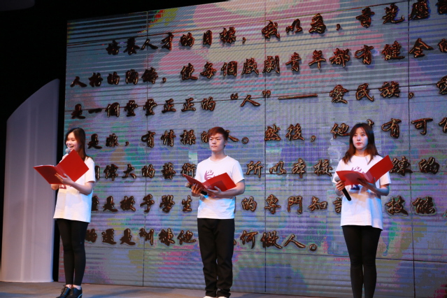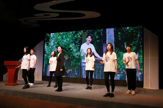 第四篇章“不忘本来、吸收外来、面向未来”,由16级导表演艺术博士研究生滕晓鹏引领同学们从“熊佛西到外百老汇”。通过排演校庆话剧《熊佛西》,滕晓鹏感到老校长熊佛西先生便是不忘本来、吸收外来、面向未来的典范。熊佛西院长的孙子、音乐剧中心教师熊梦楚老师作为嘉宾,上台分享了熊佛西院长的事迹;18级音乐剧班的本科生也深情朗诵了校友写给熊院长的信,带给观众无穷感动。滕晓鹏以熊佛西院长为榜样,将自己的英文版话剧《枫梓乡》搬上了外百老汇Theatre Row剧院,让中国故事唱响纽约主流剧场,也让观众深感振奋。结尾处,18级音乐剧本科生以阿卡贝拉形式演唱了校歌,现场气氛热烈,活动到达高潮。在校歌声中,同学们不仅点燃了爱党爱国爱校热情,更思考着如何让艺术作品进入主流市场、影响主流人群,让中国声音在世界舞台上越来越洪亮。