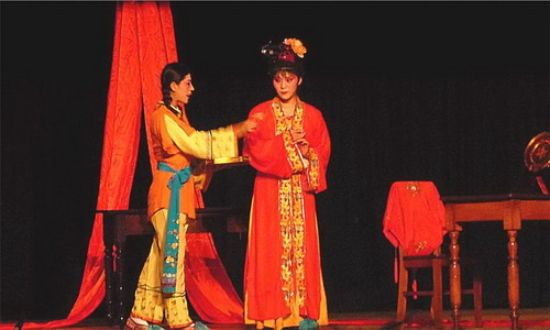 图为我校学生表演京剧《血的婚礼》