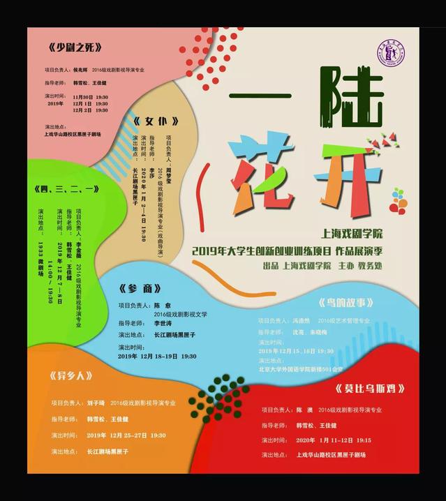 “一陆花开”上海戏剧学院2019年大学生创新创业训练项目作品展演季,是由上海戏剧学院教务处主办的学生作品展演活动。此次展演季中7个剧目全部选自2019年上海戏剧学院大学生创新创业训练计划扶持项目(以下简称“大创”)。这也是上海戏剧学院首次选取“大创”剧目以演出季的形式在校外售票公演。
