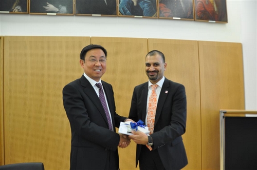 11月5日,楼巍书记与基森大学校长亲切握手,互赠礼品