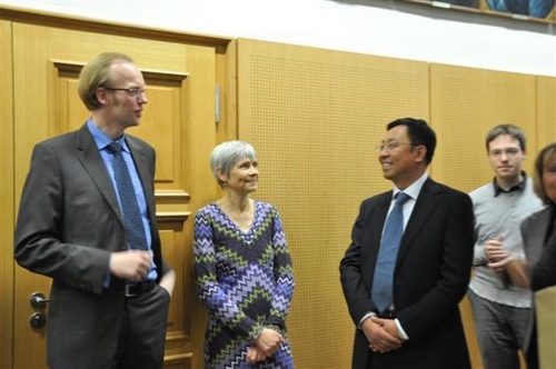 11月8日,代表团横跨半个德国,来到了柏林自由大学,在愉快地会见了柏林大学主要领导人的同时,更惊喜地遇到了正在该校作为交流学者进行访问的复旦大学教授余匡复先生。会谈再次展开,而会议的主题又自然而然地转向了“跨领域”话题。会间我方了解到,柏林自由大学也正致力于邀请各国的文化研究领域的学者赴德国进行“跨文化交融”的研究,也十分希望能够有更多的中国学者前往,帮助欧洲进一步了解中国。最后,楼巍书记与柏林自由大学媒体与文化管理学院代表Klaus Siebenhaar教授签订了关于由双方共同于2011年3月举办,在上海戏剧学院进行的为期6周的剧场管理进修项目的协议。