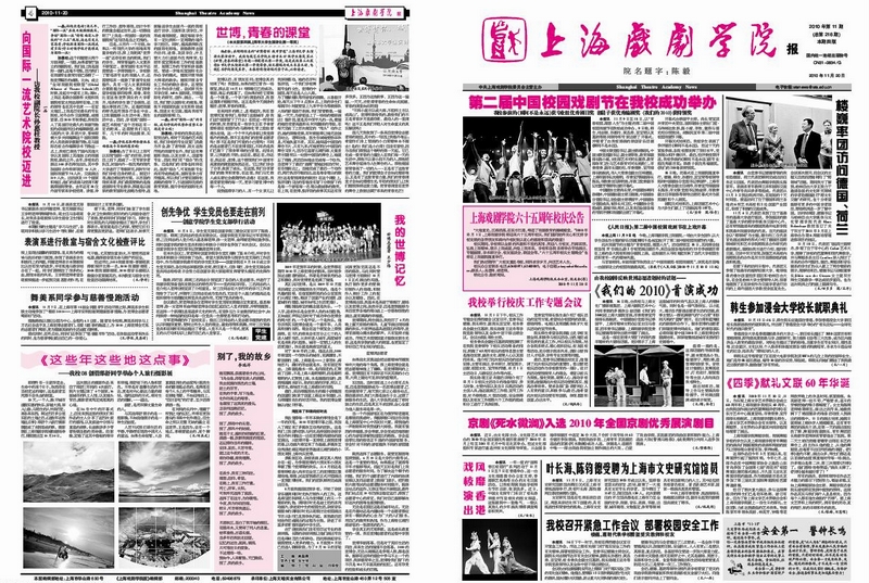 《上海戏剧学院报》2010年第11期(总第216期)已于2010年11月20日出版,本期四版。重点内容有:《第二届中国校园戏剧节在我校成功举办》、《楼巍率团访问德国、荷兰》、《韩生参加浸会大学校长就职典礼》、《我校举行校庆工作专题会议》、《<四季>献礼文联60周年华诞》等,敬请关注。也可从校园网主页新闻中心内院报专栏点击下载观看。(图文/戎戎 编辑/戎戎)