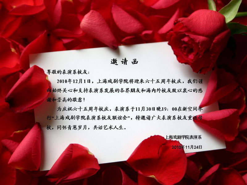 为庆祝上海戏剧学院65周年校庆,表演系将于11月30日晚19:00在新空间举行“上海戏剧学院表演系校友联谊会”,特邀请广大表演系校友重返母校,同怀青葱岁月,共话艺术人生。(选自表演系网页 编辑/戎戎)