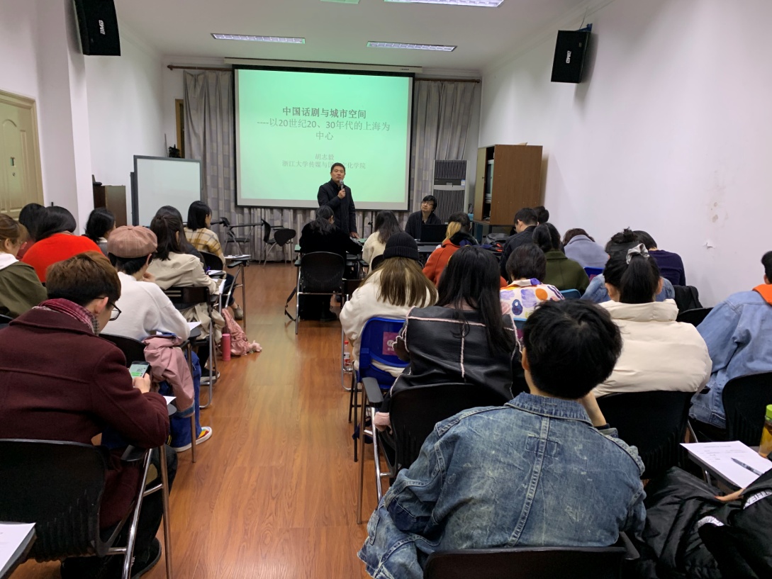 胡教授的学术研究领域颇为广泛,对话剧、影视、美学、建筑、文化传播、哲学等方面皆有自己独到的见解。讲座中,胡教授向同学们提出了“城市戏剧”这一概念,随后仔细地讲解了中国话剧和城市空间二者之间的关系。胡教授引用了美国建筑学家路易斯·芒福德的观点,认为城市因其独特的地理环境,本身就是“社会活动的剧场”。纵观二十世纪话剧在中国的发展历史,从“文明新戏”“新剧”开始,再到20年代以田汉南国社为代表的城市话剧、30年代诞生的左翼戏剧等,都是上海历史上具有文化地理色彩的新艺术、新景观。胡教授认为,在上海大都会的地理空间上诞生的话剧作品,具有鲜明的现代性神话和革命/左翼神话色彩,上海的话剧人以早期话剧经验为基础,于时代浪潮和都市空间上建立起了紧密联系的戏剧共同体。不论春柳社、春阳社、进化团抑或民众剧社、戏剧协社、左翼剧联等等,都是戏剧人在“都市”这一场域中构建的共同体。共同体也在城市化进程之中,形成了文化与权力、象征与抵抗的关系。