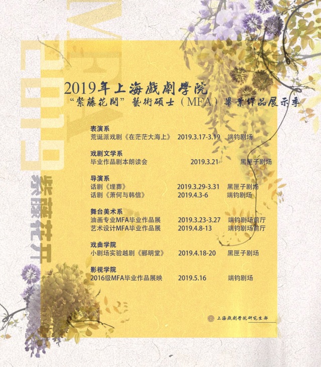 2019年3月中旬起,为期近一个月的紫藤花开——上海戏剧学院艺术硕士毕业演出季拉开大幕,先后有8部艺术硕士(MFA)毕业作品、2个毕业展、1个毕业展映亮相上戏校园,成为春季校园一道独特的演出风景线。作为上海戏剧学院艺术硕士MFA培养的重要环节,毕业作品展现了MFA三年的学习成果,是MFA三年专业学习积累、进步提高的检验台。
