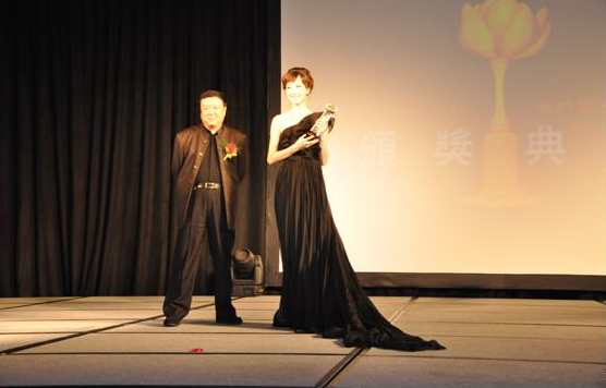07级主持专业的苑新雨同学从著名导演尤小刚手中接过最佳女主角奖杯