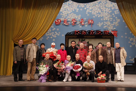 演出间隙,李长春、钳韵宏、孙毓敏、舒桐等嘉宾分别作了简短的发言,他们对田老师的师德师风,教学成果,对本次展演的深远意义给予了充分肯定。他们表示:“田恩荣老师教学成果展演”的隆重举办,不仅对京剧花脸艺术的正确传承、发扬京剧花脸艺术的优秀传统、真正吸取净行传统的精华产生现实的有益作用,而且对展现京剧名师风采、吁请社会各界关注戏曲教育富有积极意义。著名戏曲理论家王家熙先生在为展演撰写的序言中用深情的笔墨写道:学生的成功在于田老师的精心传授,使之领悟到了“裘”派的精神实质,学生汲取的是真“裘”派的精华。回顾田老师半个世纪以来迷戏、爱戏、痴戏、教戏的心路历程,他确实不负“裘”派艺术,不负戏曲学校,更不负热爱戏曲的孩子们。田老师自幼酷爱京剧艺术,五十年来不断深入学习、钻研、探索,视京剧艺术为生命,他深得京剧净行表演,特别是“裘”派唱腔艺术精髓。他执教后,以满腔心血投入京剧人才培养的工作,几十年如一日,早出晚归,辛勤耕耘,无私奉献,兢兢业业,一丝不苟。经他的精心传授,一批又一批花脸新秀崭露头角,在舞台上竞放光彩。他在担任京剧教研组组长及京剧科科长期间,团结全体教师,身正为范、因材施教,京剧专业人才辈出。京剧专业也成为上海市的重点专业。田老师作为学科带头人,为学科的建设和发展,精心谋划、殚精竭虑,发挥了无可替代的作用。在走上分管教学的副校长岗位后,他紧抓教师队伍建设,重视基础教学,提出“夯实基础,严谨治学,高效管理,规范传承”的办学理念,并深入教学第一线,抓教学质量、教学进度、教学与演出实践的结合及教学研讨活动,使全校各专业教学规范有序,出人出戏,取得可喜成果。在教学管理的同时,田老师不断总结教学经验,撰写学术论文,多次赴美国、香港、澳门举办讲座,介绍京剧艺术,深获好评。展演结束后,田老师在热烈的掌声中走上舞台与观众见面,谈到授业恩师的教诲,田老师黯然落泪,他尊师重道的精神在此可见一斑;对于嘉宾们的褒奖,他谦逊有加,他说:“今天举办我的教学成果展演,不仅是对我个人的褒奖,也是对学校全体老师教学成果的肯定。我将以此作为新的起点,加倍努力,不负众望,为培养更多更好的京剧‘裘’派表演人才,鞠躬尽瘁,奋斗一生。”朴实的话语透出他对京剧艺术,尤其是对“裘”派艺术学习、传承的一往情深。他的这种“蜡炬成灰”的精神值得每一位戏曲表演工作者、戏曲教育工作者学习。