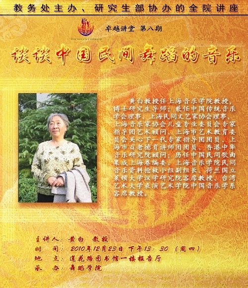 黄白:上海音乐学院教授,博士研究生导师;兼任中国传统音乐学会理事、上海民间文艺家协会理事、上海音乐家协会儿童专业委员会专家指导团艺术顾问、上海市艺术教育委员会关心下一代专家指导团团员、上海市百老德育讲师团团员、香港中华音乐研究院顾问;历任中国民间歌曲集成上海卷编委、上海音乐学院民间音乐资料抢救小组副组长、荷兰国立莱顿大学汉学研究院客席教授、台湾艺术大学表演艺术学院中国音乐学系客席教授。