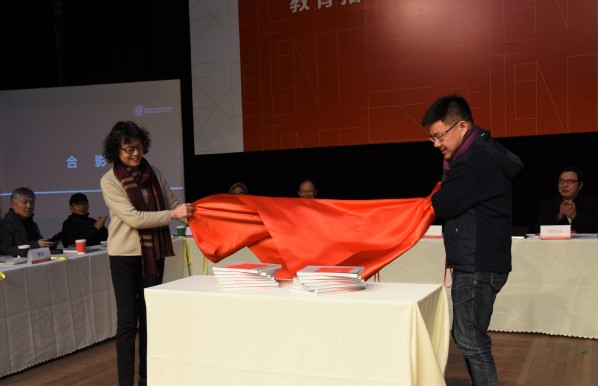 全国艺指委秘书长丁凡教授与上海戏剧学院院长黄昌勇教授为新书揭幕(《上海艺术专业学位研究生(美术、艺术设计领域)优秀作品集》)
