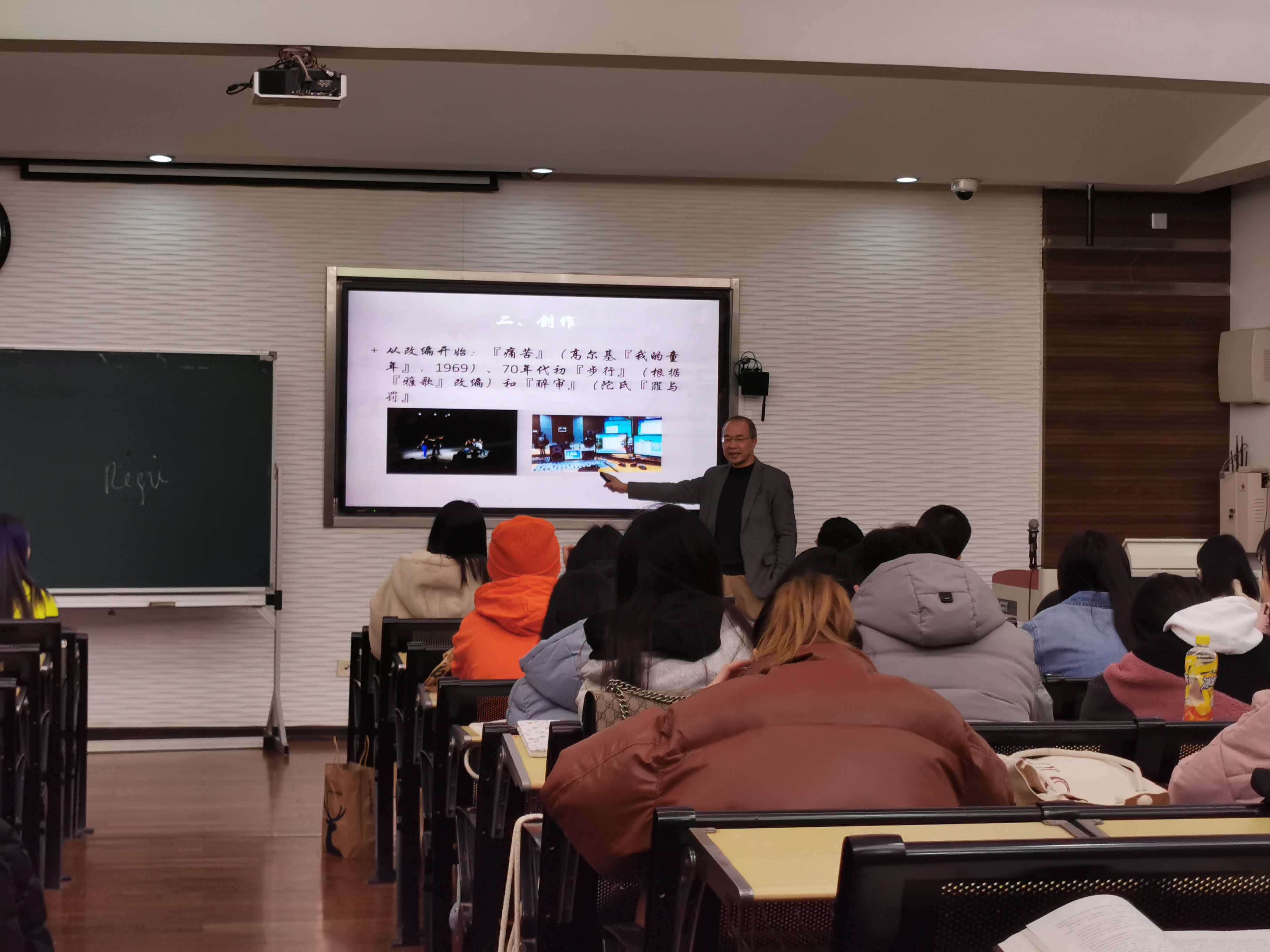 2019年12月26日下午,戏文系主办的《人文传承与治学方法》系列讲座(八)在红楼209教室如期展开,这也是本学期此系列讲座的最后一讲。讲座由戏文系主任陈军教授主持,并有幸邀请到上海戏剧学院原副院长、研究生部主任宫宝荣教授为同学们讲授《法国当代戏剧的一面大旗——科尔代斯其人其作》。