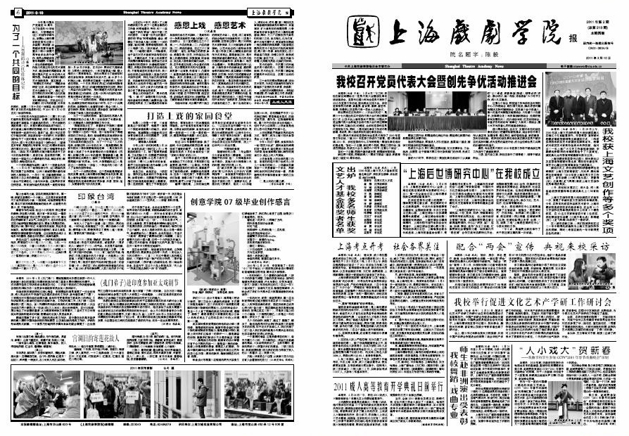 《上海戏剧学院报》2011年第2期(总第219期)已于2011年3月10日出版,本期共四版。重点内容有:《我校召开党员代表大会暨创先争优活动推进会》、《“上海后世博研究中心”在我校成立》、《配合“两会”宣传,央视来校采访》、《上海考点开考,社会各界关注》、《我校获上海文艺创作等多个奖项》等,敬请关注。也可点击下载观看。(图文、编辑/榕树)