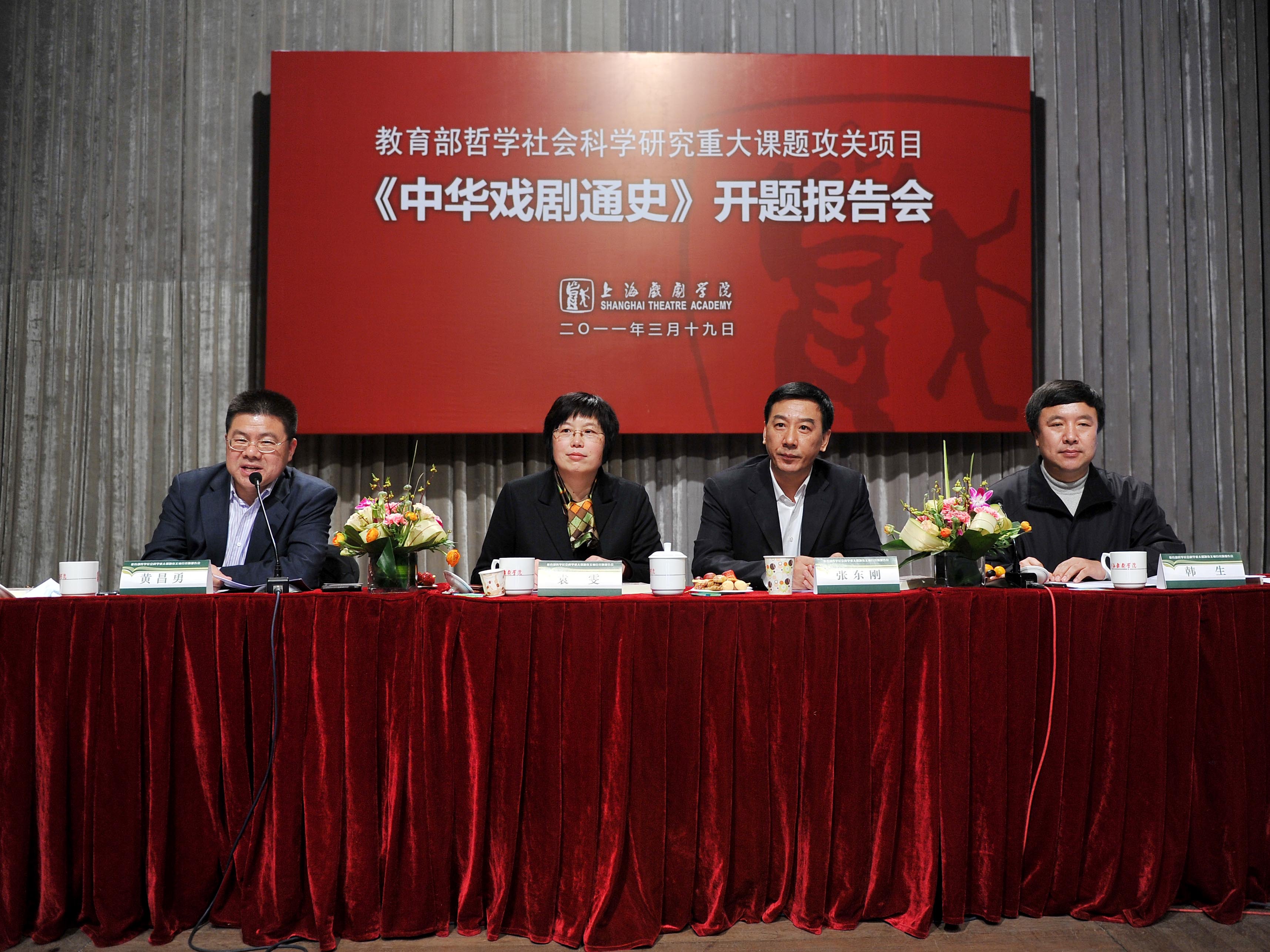 今天(3月19日)下午,教育部哲学社会科学研究重大课题攻关项目——《中华戏剧通史》开题报告会在我校新空间剧场隆重举行。教育部社科司副司长张东刚,上海市教委副主任袁雯,上海戏剧学院院长韩生等领导出席开题报告会并先后讲话。会议由黄昌勇副院长主持。