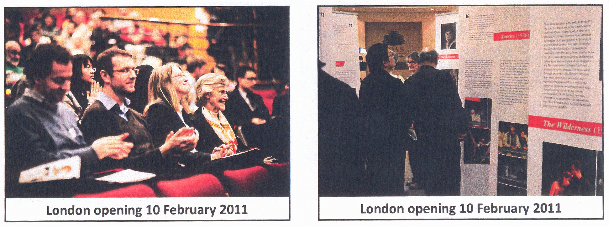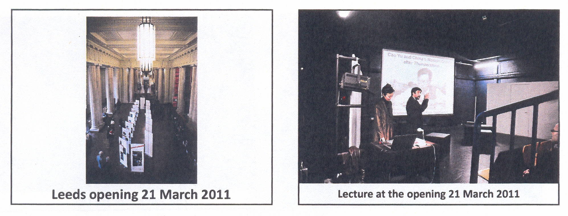 2011年2月10日,由我院戏剧博物馆与英国白玫瑰东亚研究中心/利兹大学东亚系、北京人民艺术剧院戏剧博物馆等合作主办的“曹禺:中国现代戏剧的先锋”——纪念曹禺诞辰100周年摄影展览在伦敦亚非学院开幕。中国驻英国使馆公使衔文化参赞吴逊、孔子学院院长张新生、利兹大学李如茹教授、尤德爵士夫人(Lady Youde),以及来自英国文化协会、大英博物馆、大英图书馆等文化界的百余位重要嘉宾出席。随后,展览和“曹禺生活与作品”的演讲、戏剧演出《太阳不是我们的》系列活动于3月21日在利兹继续进行。吴逊公参、曼城中国领事馆总领事倪坚、教育领事傅恒升专程前往利兹参加此次展览、演出活动。倪总领事在讲话中表示,他很高兴,中国现代戏剧能够使英国普通民众感兴趣。利兹大学副校长Richard Williams在展览开幕式上说,利兹大学非常荣幸能够和中国这样一位伟大的戏剧家有如此密切的联系。