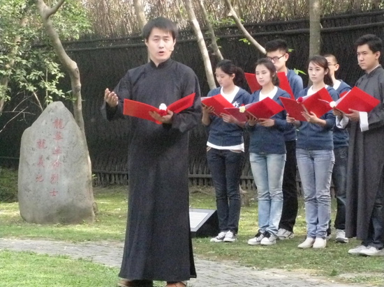 我校学生党团员在纪念碑前一同回顾了五位青年烈士平凡而伟大的一生,随后,电视学院的党团员学生一同朗诵了柔石的《战》、殷夫的《梦中的龙华》、李求实的《黄河大堤晚眺》、冯铿的《晨光辐辏的曙天时分》等经典诗词、箴言。最后同学们为纪念碑献上花篮和鲜花。