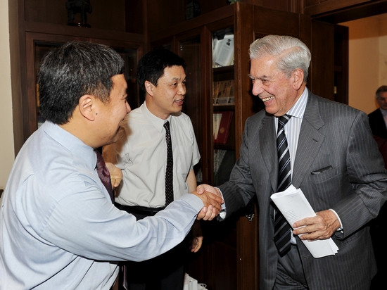 6月14日下午,2010年诺贝尔文学奖获得者、著名作家巴尔加斯•略萨来我校访问。我校院长韩生,副院长孙惠柱、黄昌勇、宫宝荣参加了接待,并在余秋雨大师工作室进行了交谈。随后,略萨在新空间与我校师生以及中国著名作家叶兆言、孙甘露进行了一次现场对话。西班牙驻上海领事馆文化参赞伊格纳西奥•莫罗、秘鲁驻华大使哈罗德•弗西斯等外方代表也出席了此次活动。