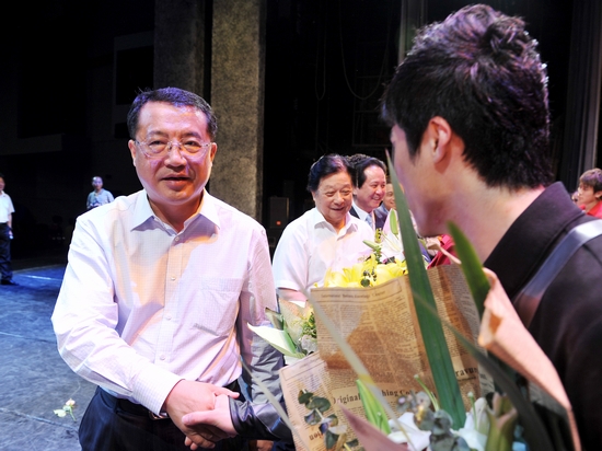 图为陈东同志与演员亲切握手