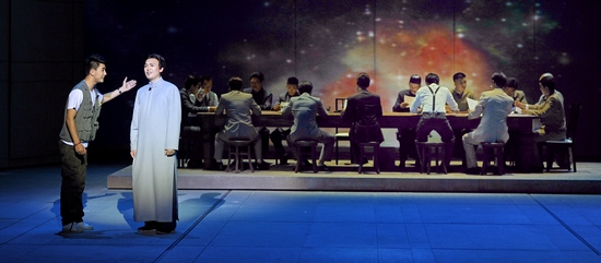 “当年,从上海的石库门走向北京的天安门,就剩我们俩人了”——同是“一大”代表的董必武和毛泽东在舞台上满怀深情的这一声勉励,震撼着现代人、尤其是现代青年人的心灵,它拉开了上海戏剧学院创排的话剧《开天辟地》的大幕。该剧由著名剧作家、解放军总政话剧团团长、中国戏剧家协会副主席孟冰担任编剧,著名话剧导演王延松执导,全剧其他主创人员均有上海戏剧学院师生及校友担任。舞台设计由院长韩生教授与舞美系主任王履玮教授联手打造,服装设计舞美系教授潘健华担任,化妆造型设计由舞美系教授徐家华担任。