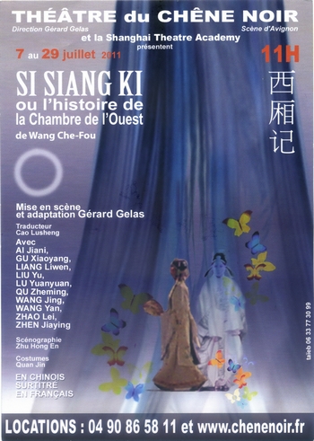 编者按:在2011年第65届法国阿维尼翁戏剧节上,我校和法国黑橡树剧院合作排演的话剧《西厢记》连演23场,获得了欧洲观众与法国媒体的高度评价。这是我校首次参加这一戏剧盛会,《西厢记》的成功演出,不仅是对我校表演教学的一次严格检验,也是中法戏剧交流史上的重要文化事件。该剧由法国著名导演吉拉尔•吉拉斯与表演系教师吕岩联合执导,吉拉斯与我校曹路生教授共同改编,舞台设计为舞美系研究生朱洪恩,服装设计与人物造型设计分别为舞美系教师全金和冯燕容,表演系08级戏剧(影视)表演本科班同学赵磊、陆媛媛、甄伽莹、王妍、王靖、艾佳妮、梁立文、曲哲明、刘禹、顾晓阳参加演出。