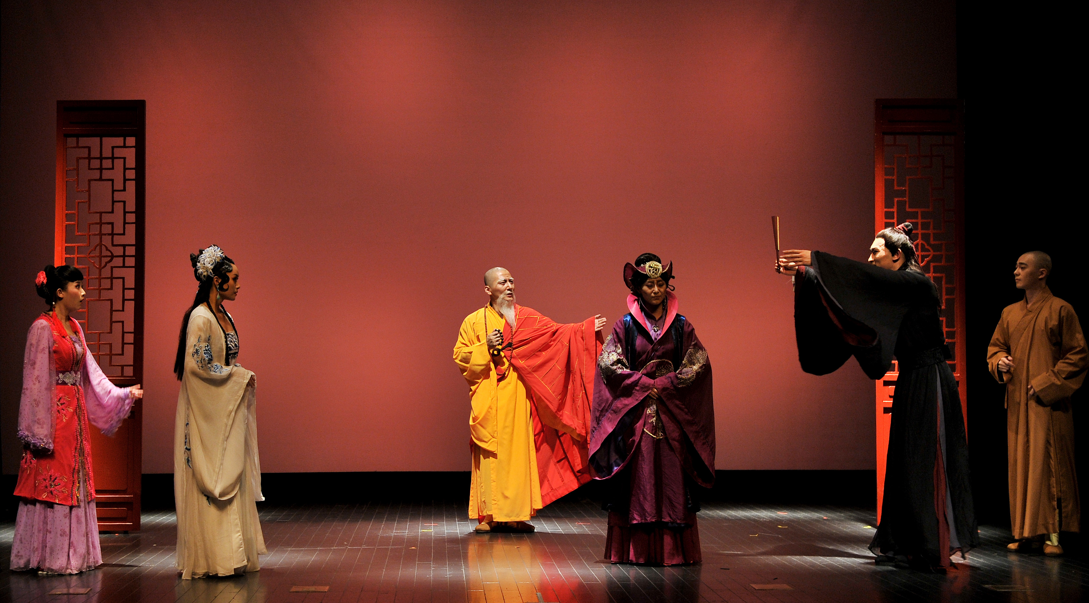 整个戏看下来,给我留下印象最深刻的是每场换景的过程,都是由张生的书童通过舞蹈、肢体语言或内心活动来讲幕拉开或合上的,这一细节使整出戏剧的演出完整,每一幕的衔接延续了上一幕人物的情感和内心纠葛,可以使观众整一个进入完整的情境中,而没有置身事外的感觉。在人物的走为上,也是符合中国戏曲的传统方式,打破空间和时间的界限,这也算是对中国传统戏曲的一种尊重。