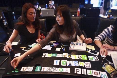 历时七天的创意学院中韩国际设计工作坊于23日结束。23日上午,工作坊作品汇报与总结在虚拟实验室进行,创意学院刘志新副院长出席,丁肇辰教授主持。等经过几天的努力,创意学院08视觉的全班同学与韩国釜山设计中心的7位韩国同学在老师的带领下分组进行创作,他们从陌生到熟悉,从最初意见不一,不断的调整方案,改变方案,直至达成共识,在作品创作过程中同学们克服了语言的障碍,成为了朋友,最后共同完成了作品。作品以不同的形式体现,最终各小组交上了一份满意的答卷。丁肇辰教授进行了讲评。